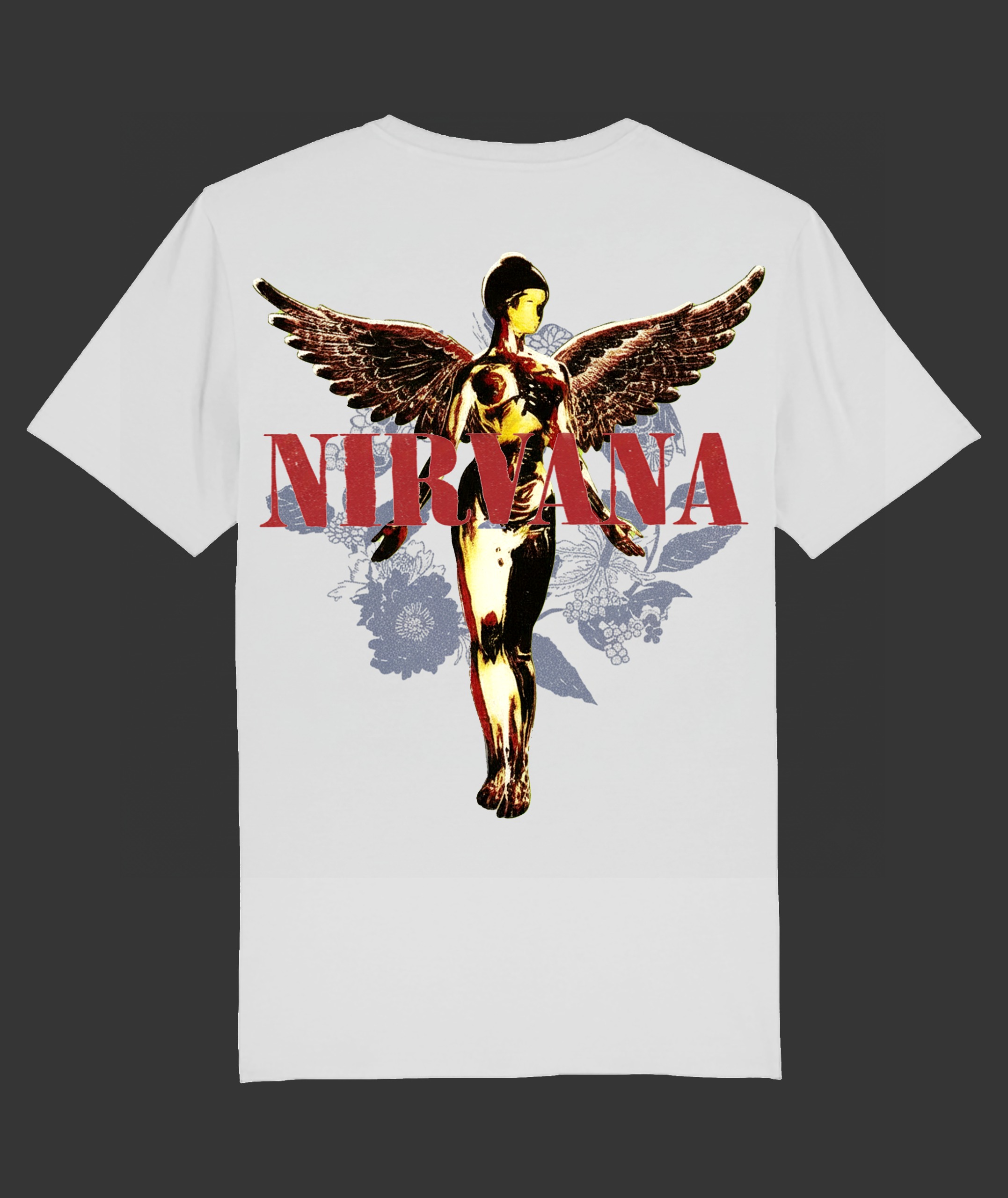 The design features a striking angel figure with a statuesque metallic finish, bold red “NIRVANA” lettering, and subtle floral elements that add depth and texture. Printed with high-quality, long-lasting inks, the artwork stands out with a true vintage-grunge aesthetic.